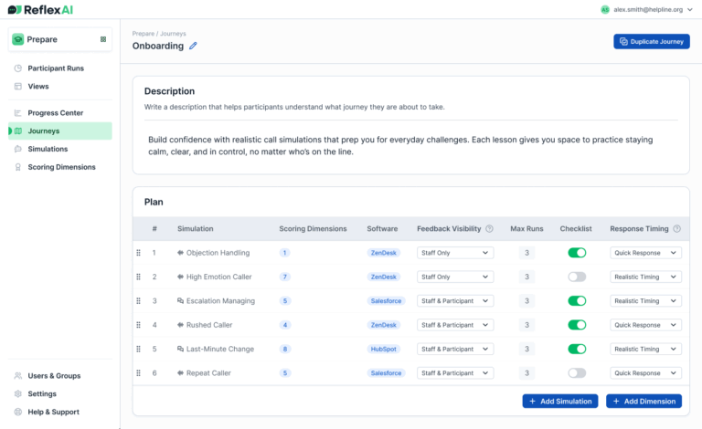 Using ReflexAI Studio, build simulations and scoring dimensions from scratch – putting you in full control of scenario designs and evaluation metrics.